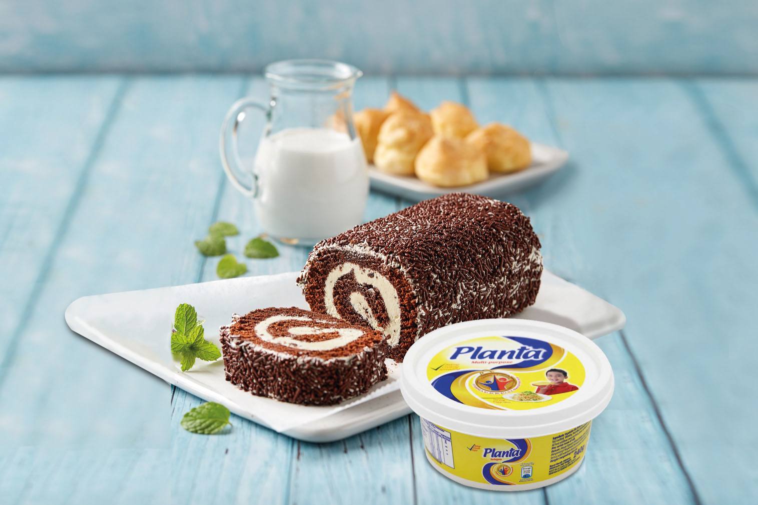 - Very carefully unroll the cake. Gently add one even layer of the chocolate whipped cream onto the unrolled cake.